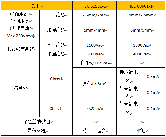 根據(jù)安規(guī)標(biāo)準(zhǔn),EN60950-1 ClassI最大漏電流不可超過(guò)3.5mA;而EN60601-1最大漏電流不可超過(guò)0.3mA。量測(cè)時(shí)各別的安全距離、保險(xiǎn)絲數(shù)量多有不同,其相關(guān)差異如下表列: